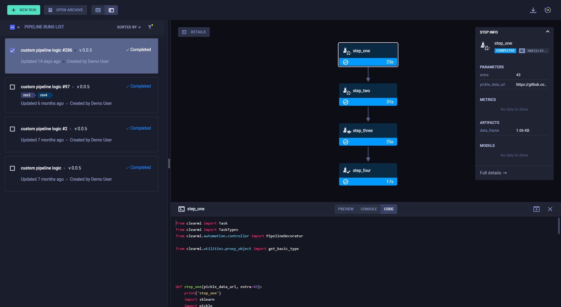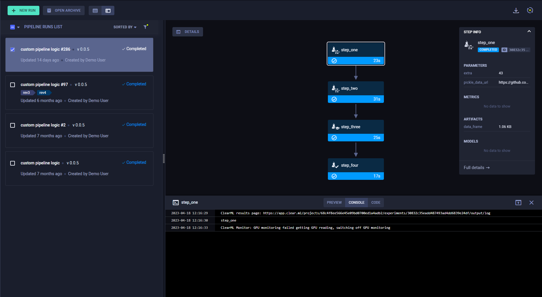 Console - The console log for the pipeline controller or steps: contains everything printed to stdout and stderr.
