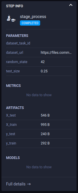 To view a run's complete information, click Full details, which will open the pipeline's controller task page. View each list's complete details in the pipeline task's corresponding tabs: