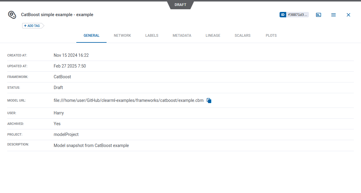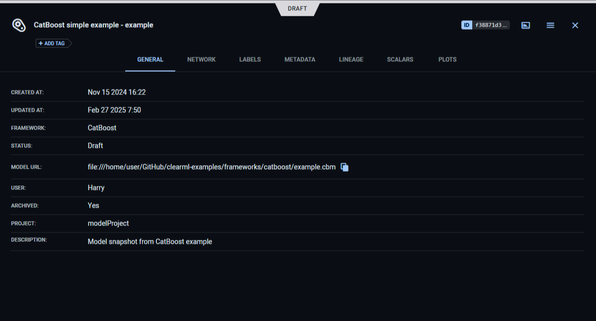 Models created by the task appear in the task's ARTIFACTS tab. ClearML automatically logs and tracks models created using CatBoost.