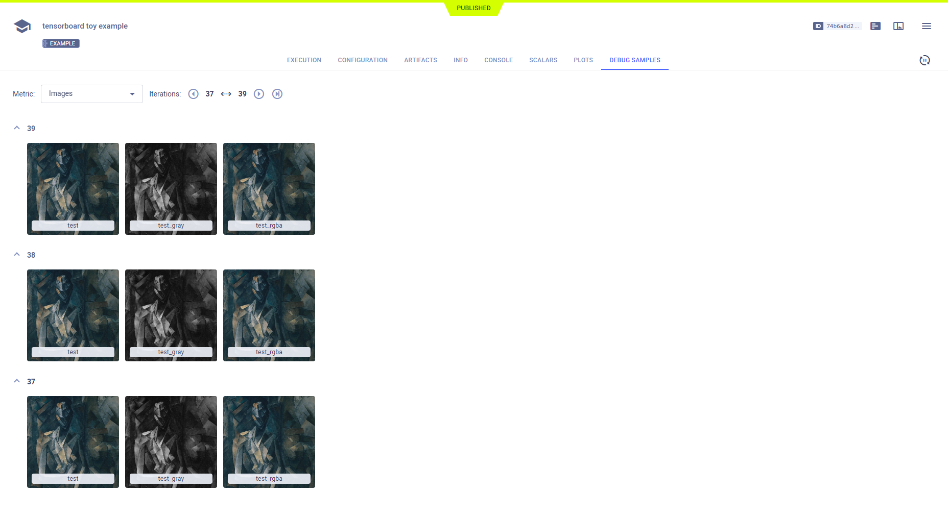ClearML also supports reporting media (such as audio, video and images) for every iteration. This section is mostly used for debugging. It's recommended to use artifacts for storing script outputs that would be used later on.