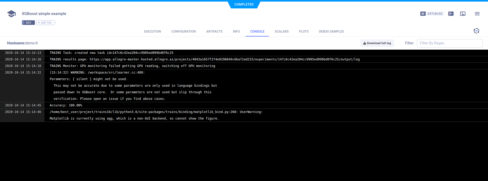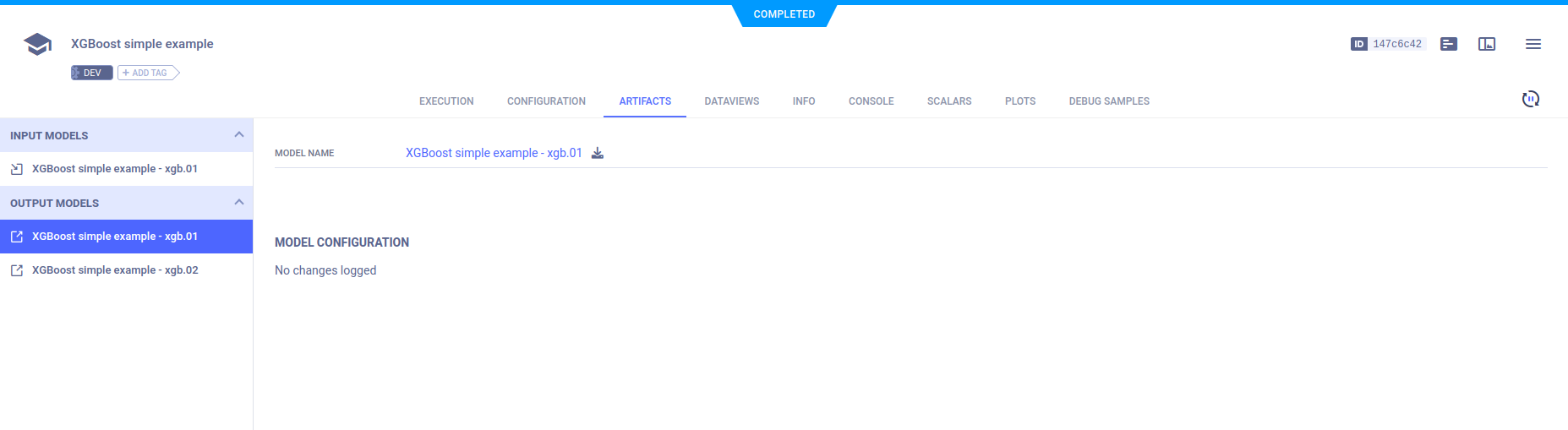 Models created by the task appear in the task's ARTIFACTS tab. ClearML automatically logs and tracks models and any snapshots created using XGBoost.