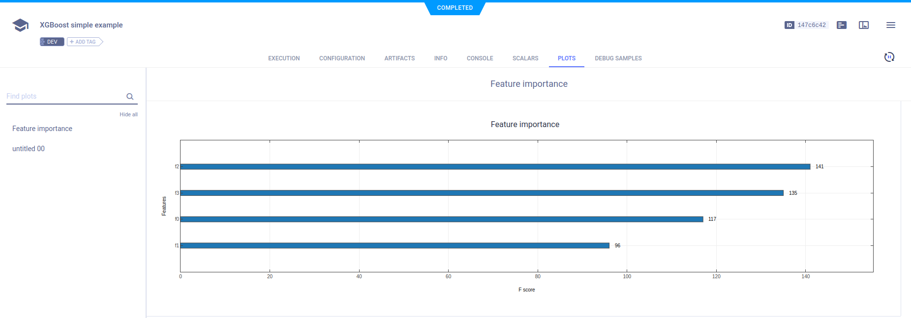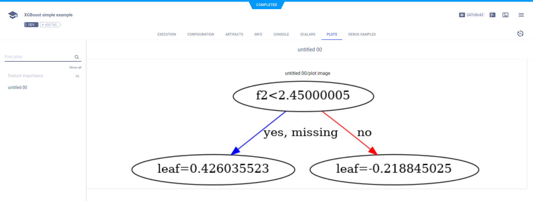 The feature importance plot and tree plot appear in the task's page in the ClearML web UI, under PLOTS.