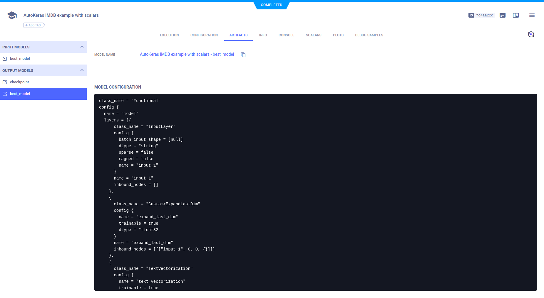 The autokeras_imdb_example.py example script demonstrates the integration of ClearML into code, which uses autokeras.