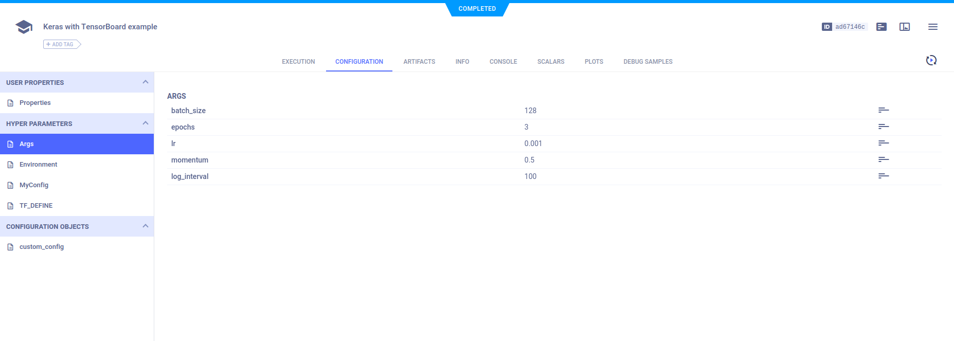 Hyperparameters are grouped by their type and appear in CONFIGURATION > HYPERPARAMETERS. Once an experiment is run and stored in ClearML Server, any of these hyperparameters can be modified.