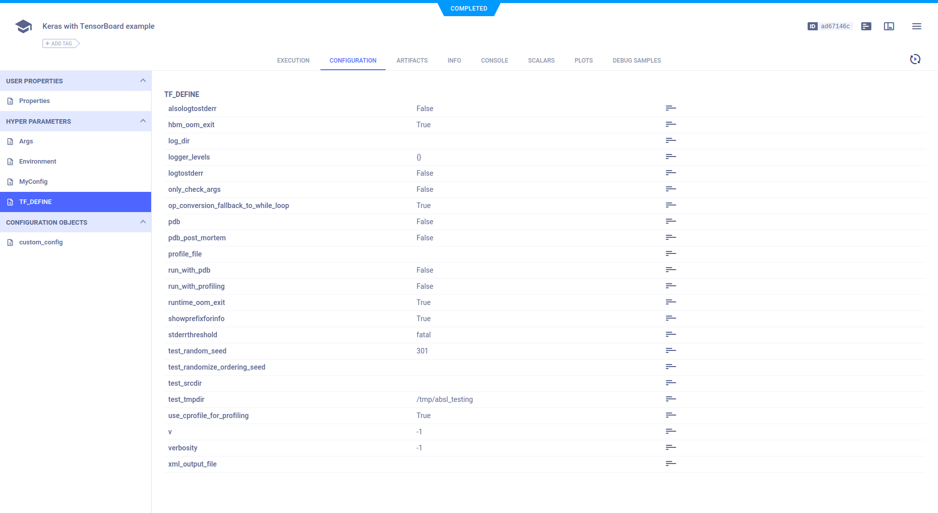 The TF_DEFINE parameter group shows automatic TensorFlow logging.