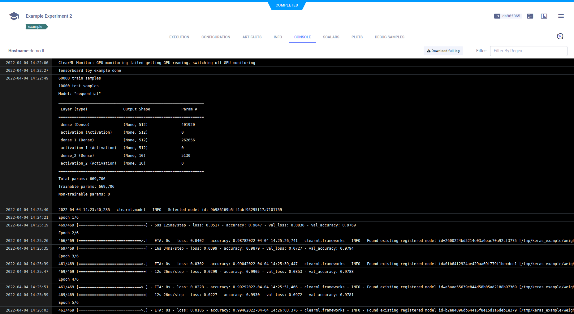 The complete experiment log containing everything printed to stdout and stderr appears in the CONSOLE tab. The full log is downloadable. To view the end of the log, click Jump to end.