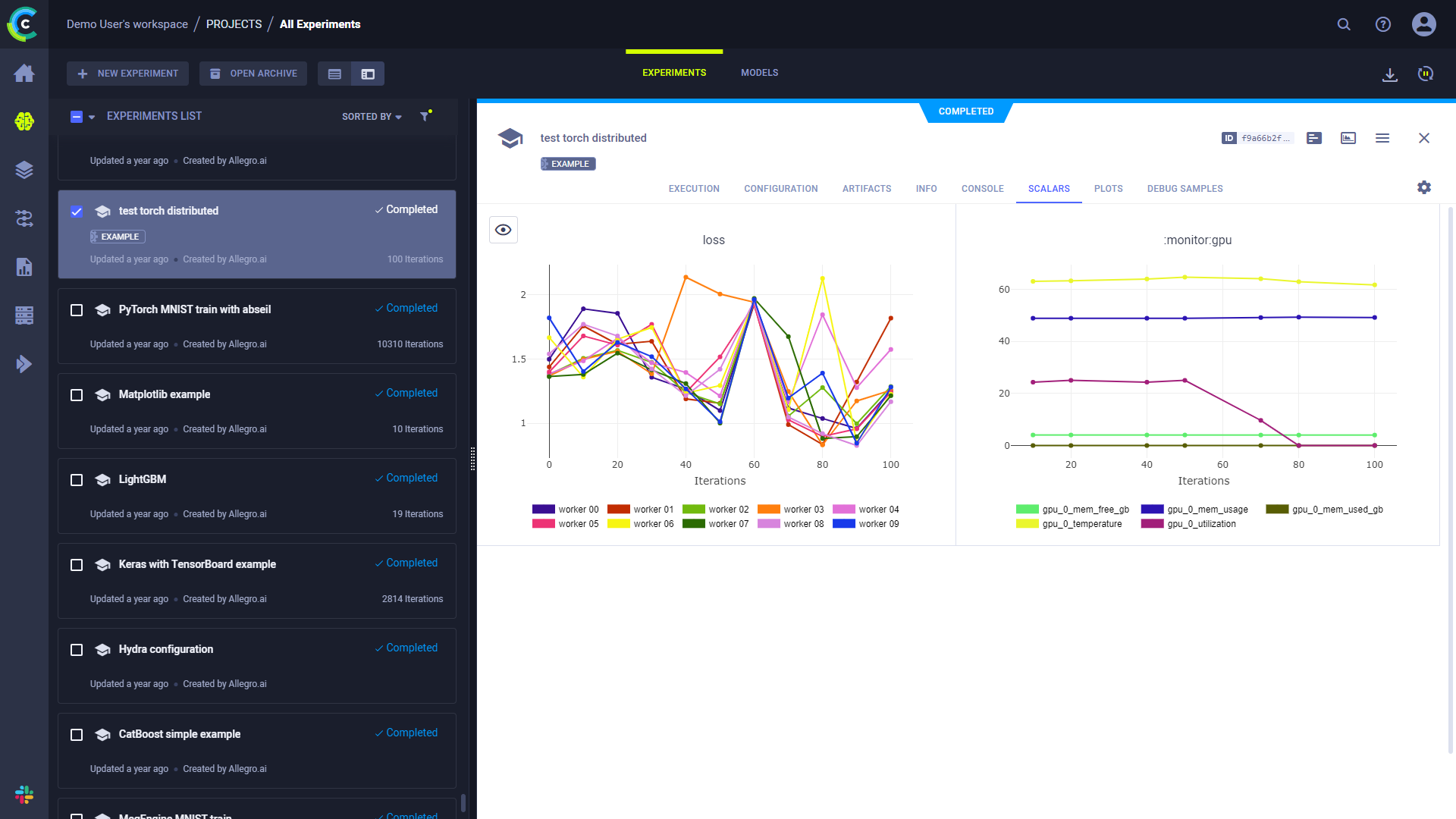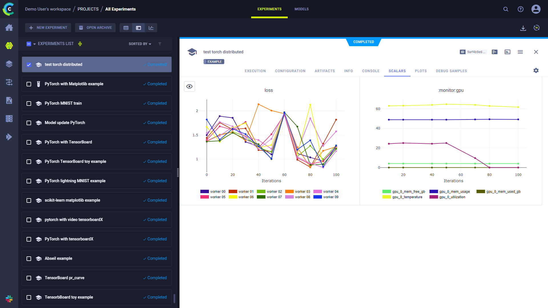 While an experiment is running, and any time after it finishes, track it and visualize the results in the ClearML Web UI, including:
