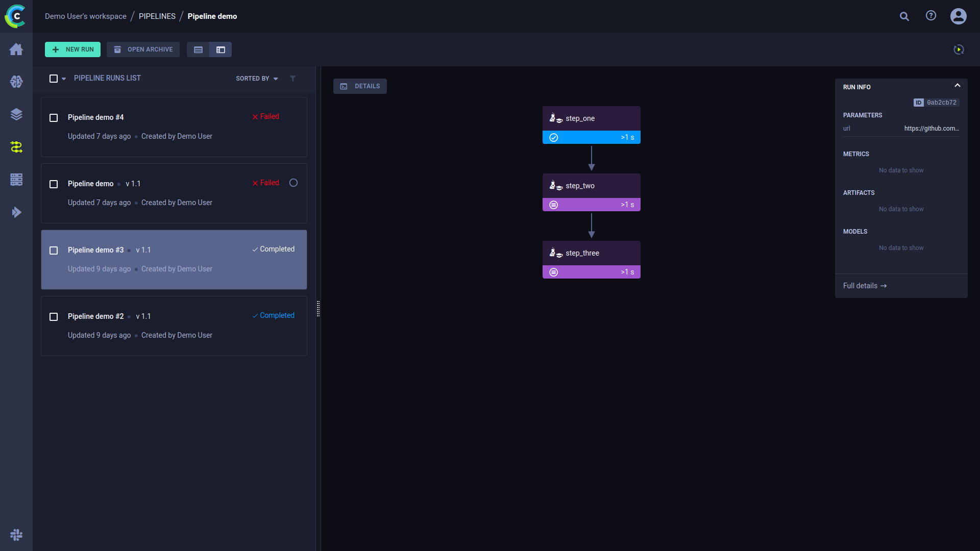 The pipeline run’s page contains the pipeline’s structure, the execution status of every step, as well as the run’s configuration parameters and output.