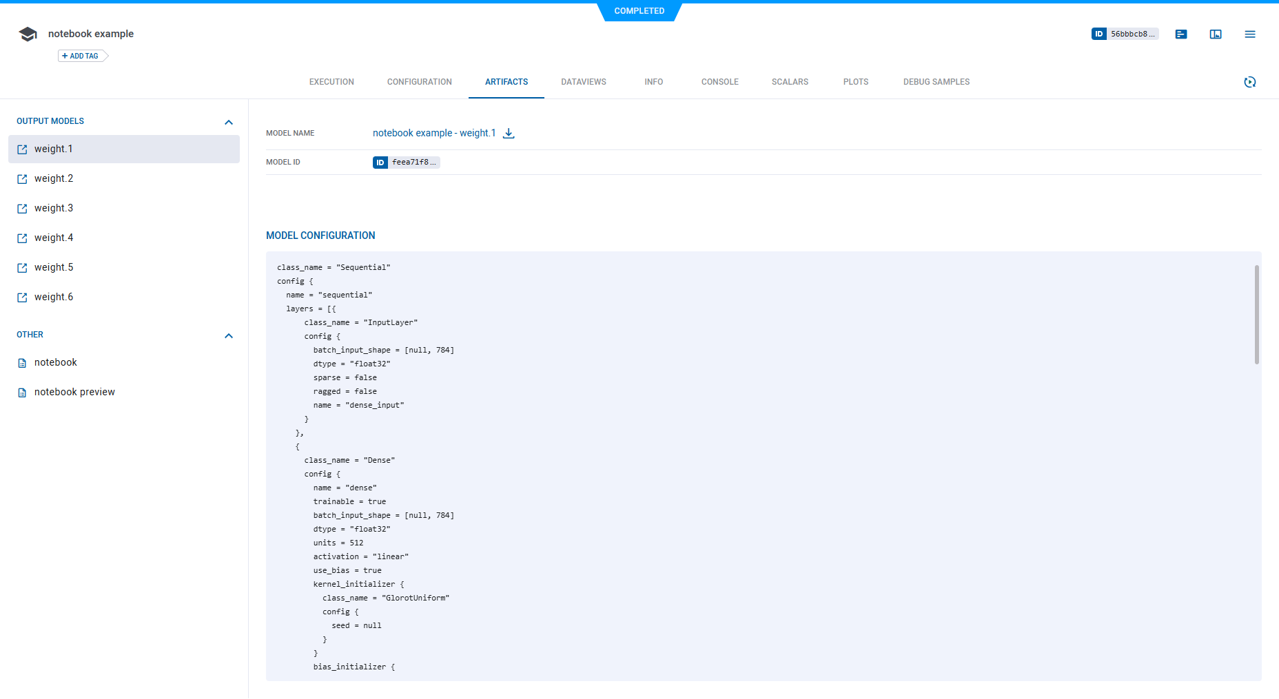 Models created by the task appear in the task's ARTIFACTS tab. ClearML automatically logs and tracks models created using Keras.