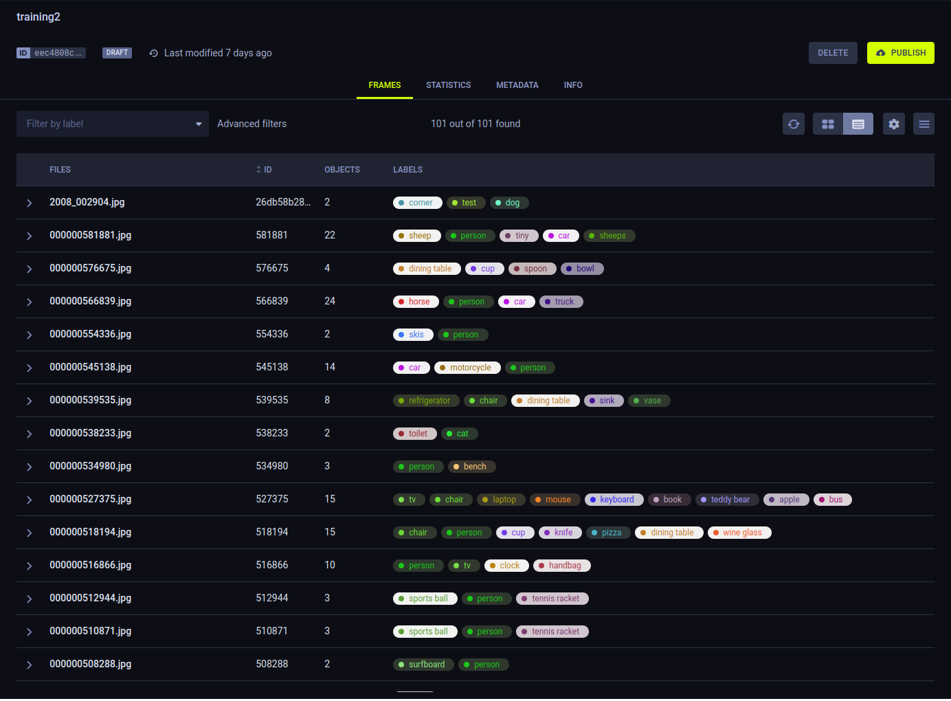 The dataset version's frames can be filtered by multiple criteria. The resulting frames can be exported as a JSON file.