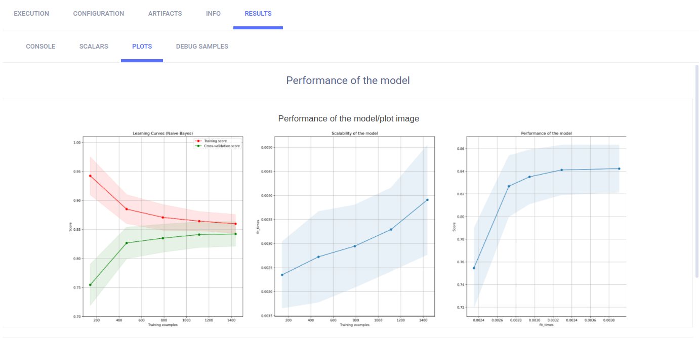 matplotlibto plot the learning curves. - ClearML automatically logs the scatter diagrams for the learning curves.