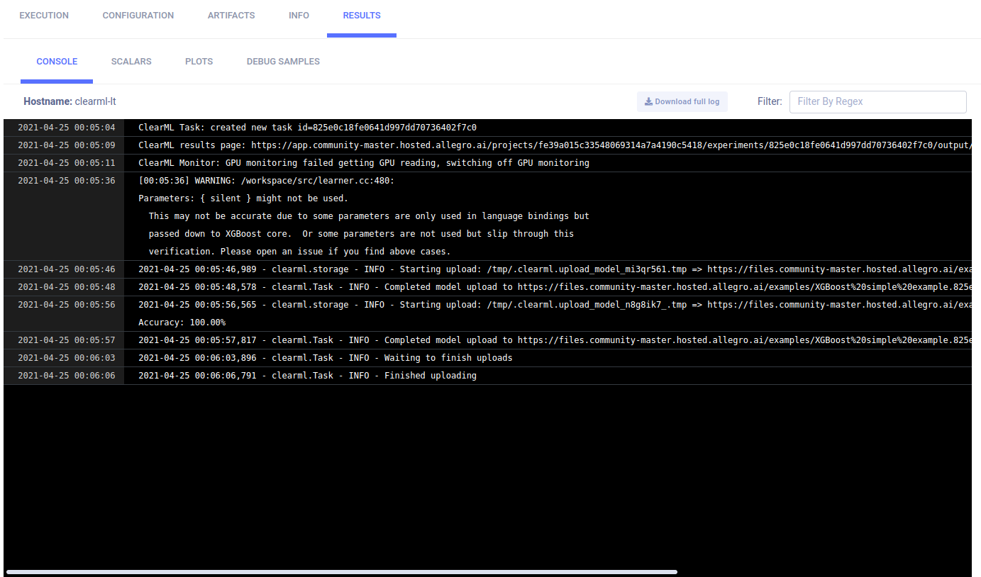 Models created by the experiment appear in the experiment’s ARTIFACTS tab. ClearML automatically logs and tracks models and any snapshots created using XGBoost.