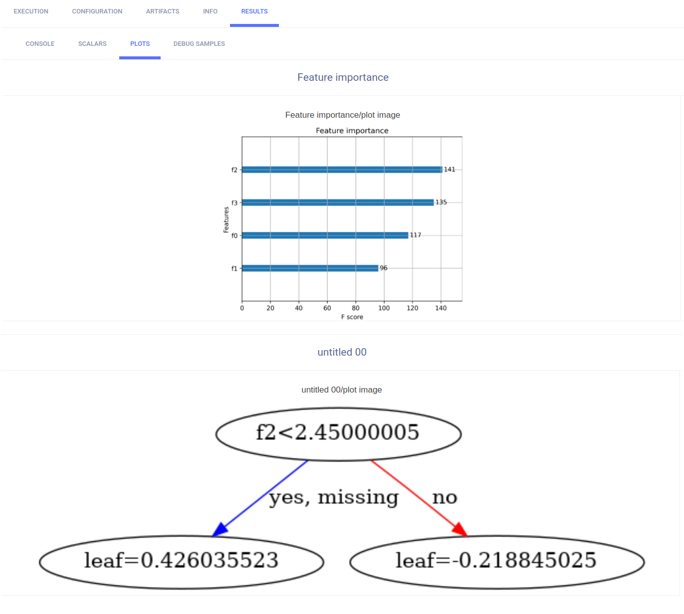 The feature importance plot and tree plot appear in the project's page in the ClearML web UI, under RESULTS > PLOTS.