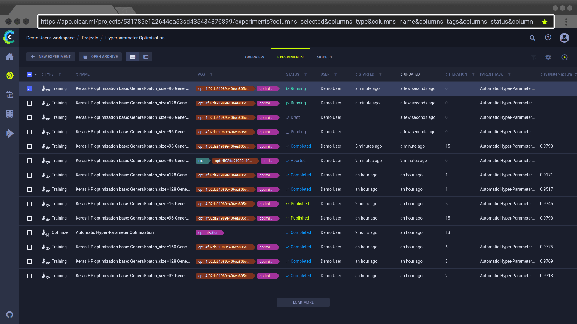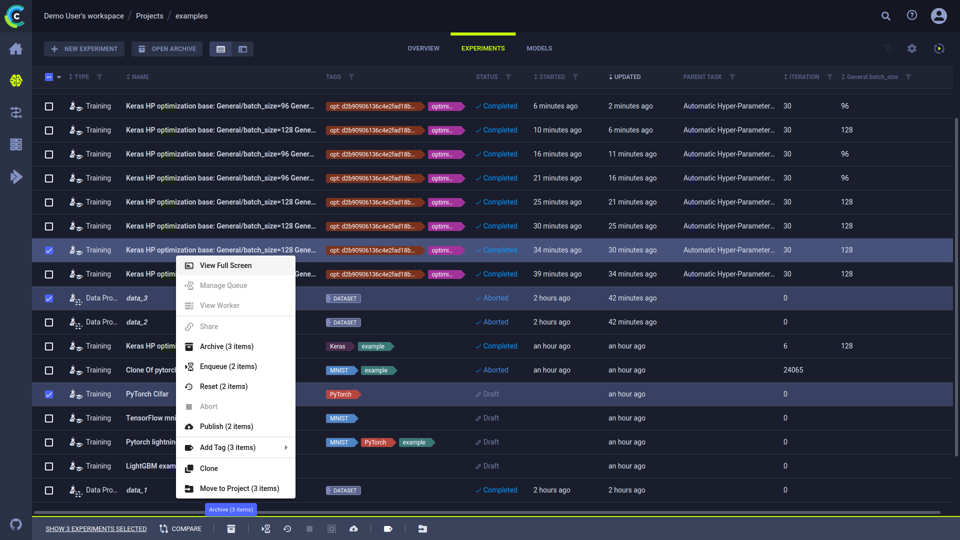 The experiments table is a customizable list of experiments associated with a project. From the experiments table, view experiment details, and work with experiments (reset, clone, enqueue, create tracking leaderboards to monitor experimentation, and more). The experiments table's auto-refresh allows users to continually monitor experiment progress.