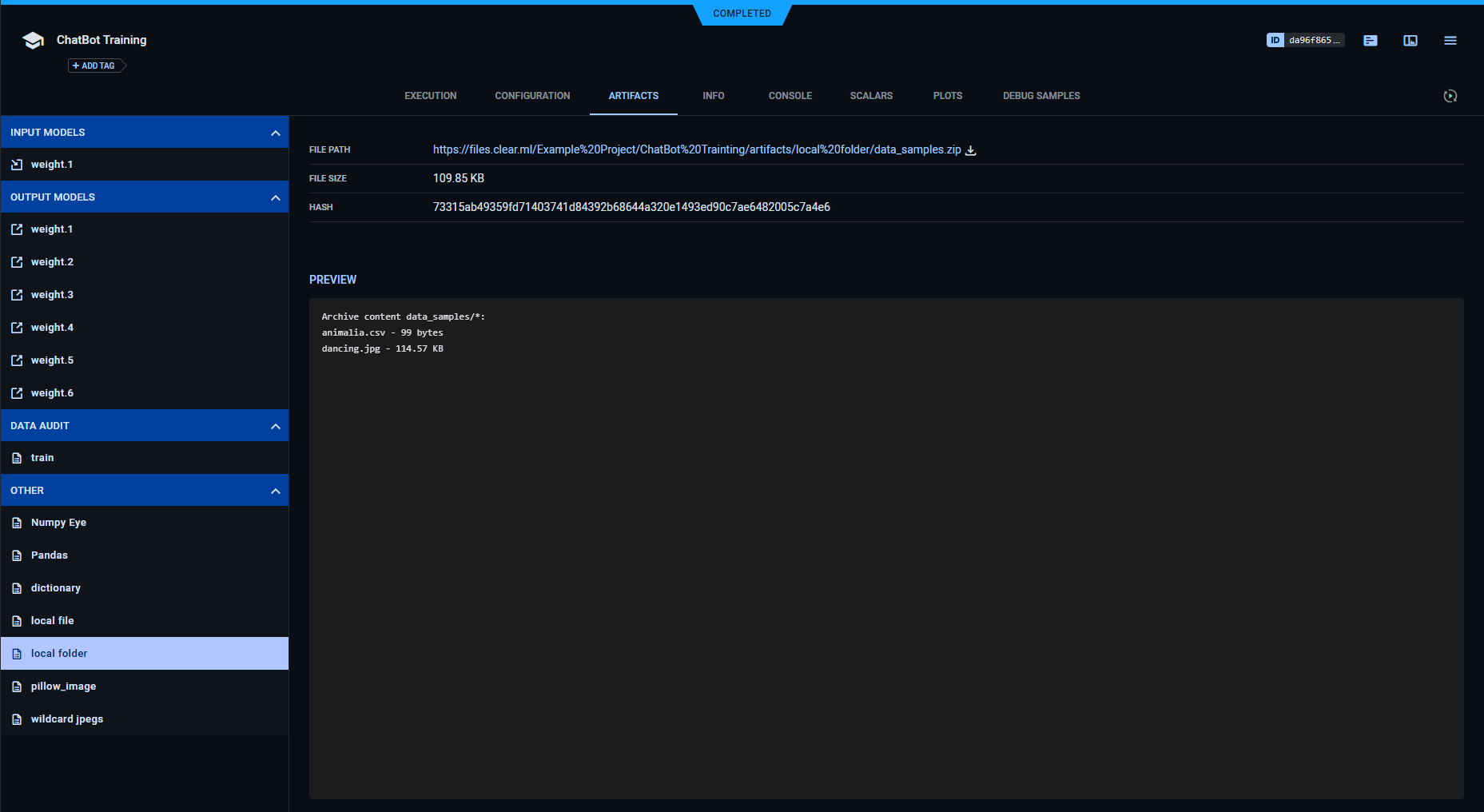 ClearML automatically logs artifacts created by popular frameworks, including TensorFlow and PyTorch. See supported frameworks.