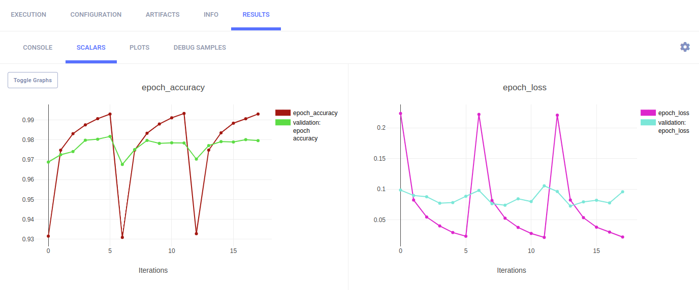 The jupyter.ipynb example demonstrates ClearML's automatic logging of code running in a Jupyter Notebook that uses Keras and Matplotlib.