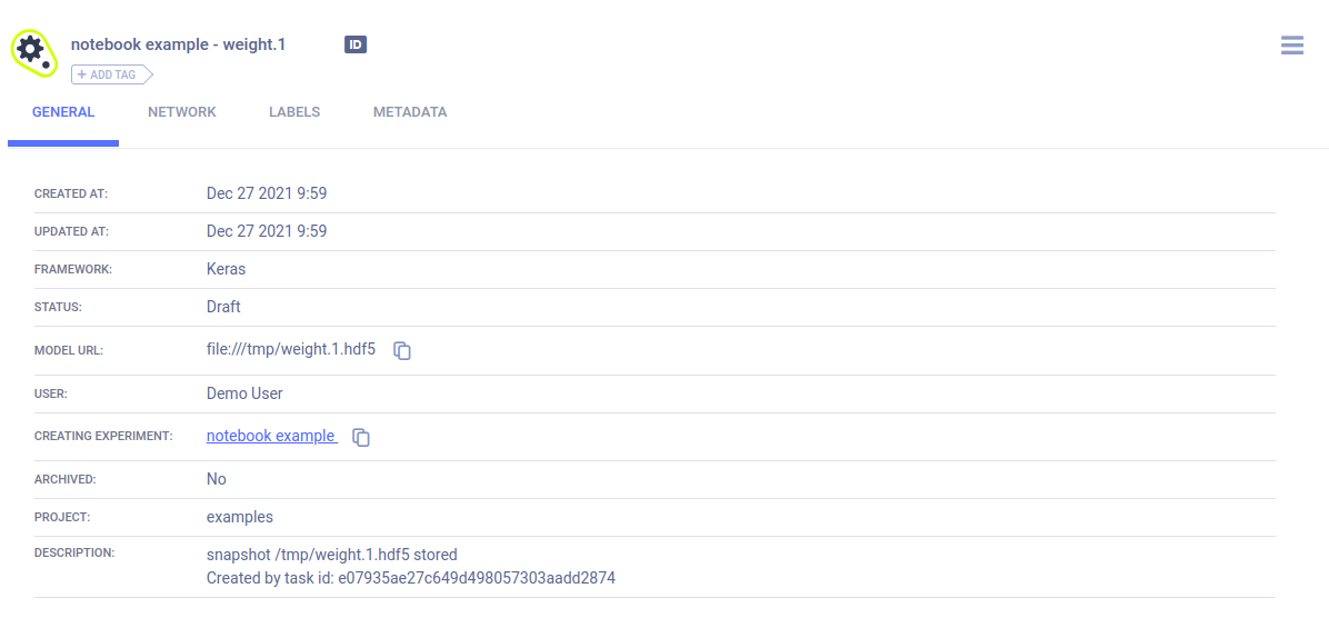 Model artifacts associated with the experiment appear in the experiment info panel (in the EXPERIMENTS tab), and in the model info panel (in the MODELS tab).
