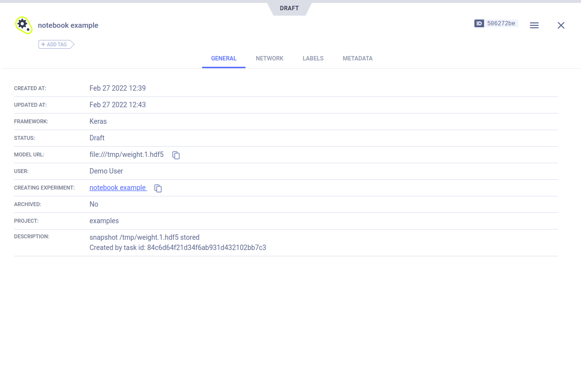 Model artifacts associated with the experiment appear in the experiment info panel (in the EXPERIMENTS tab), and in the model info panel (in the MODELS tab).