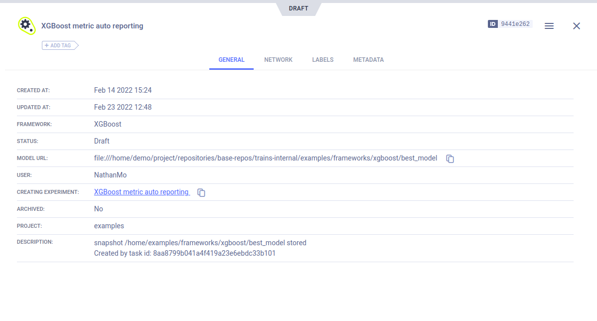 To view the model details, click the model name in the ARTIFACTS page, which will open the model's info tab. Alternatively, download the model.
