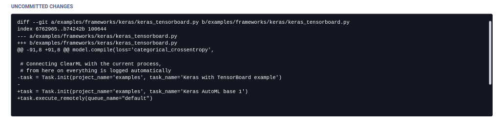 ClearML displays the git diff of the experiment in the Uncommitted Changes section.
