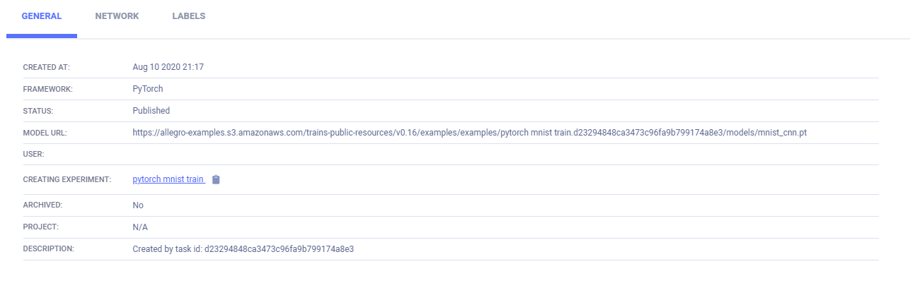 Model artifacts associated with the experiment appear in the info panel of the EXPERIMENTS tab and in the info panel of the MODELS tab.