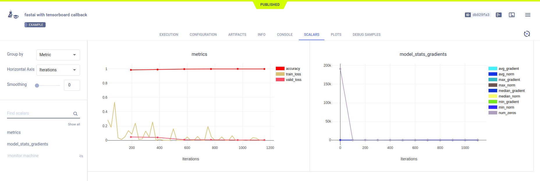 The fastai_with_tensorboard_example.py example demonstrates the integration of ClearML into code that uses FastAI v1 and TensorBoard.
