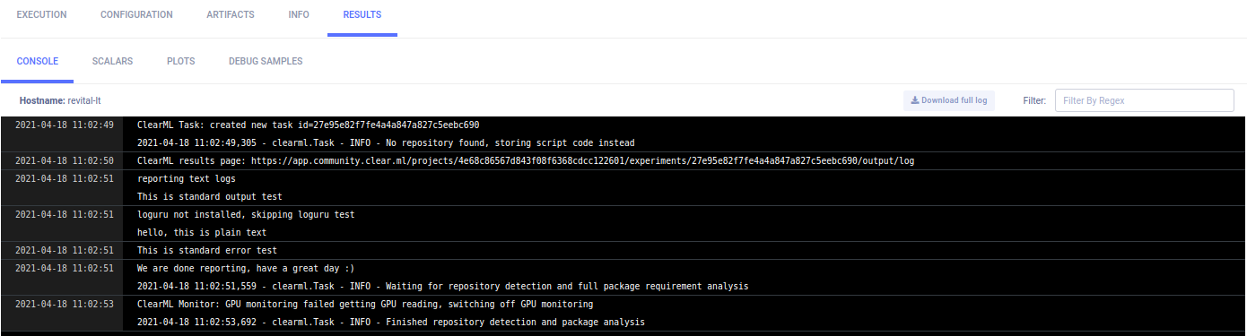 The text_reporting.py script demonstrates reporting explicit text, by calling the Logger.report_text method.