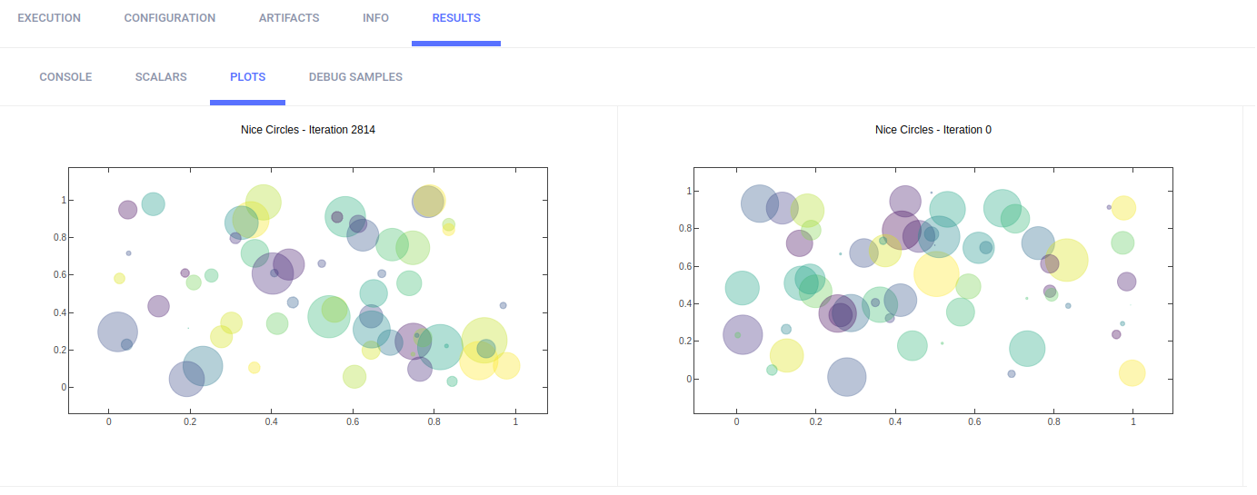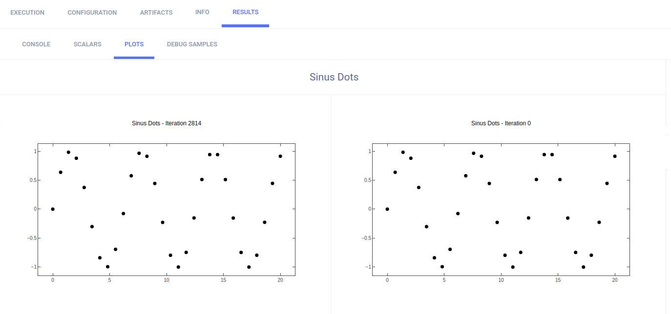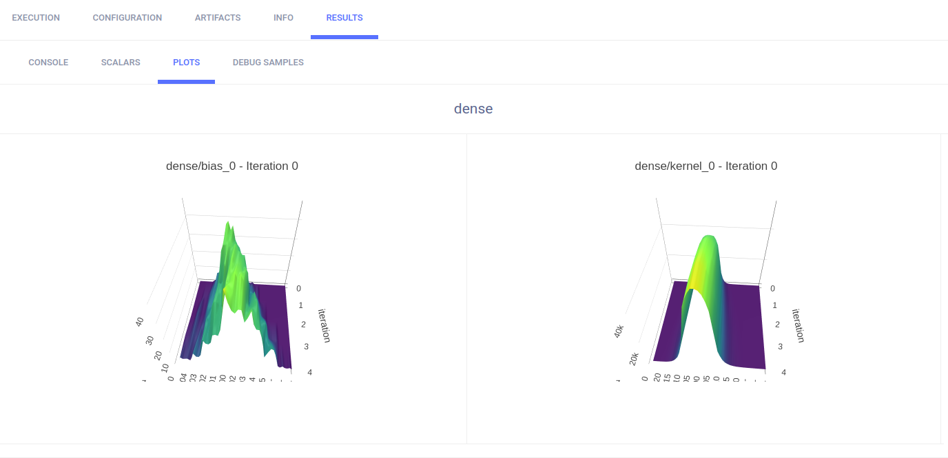 The example calls Matplotlib methods to create several sample plots, and TensorBoard methods to plot histograms for layer density. They appear in RESULTS > PLOTS.