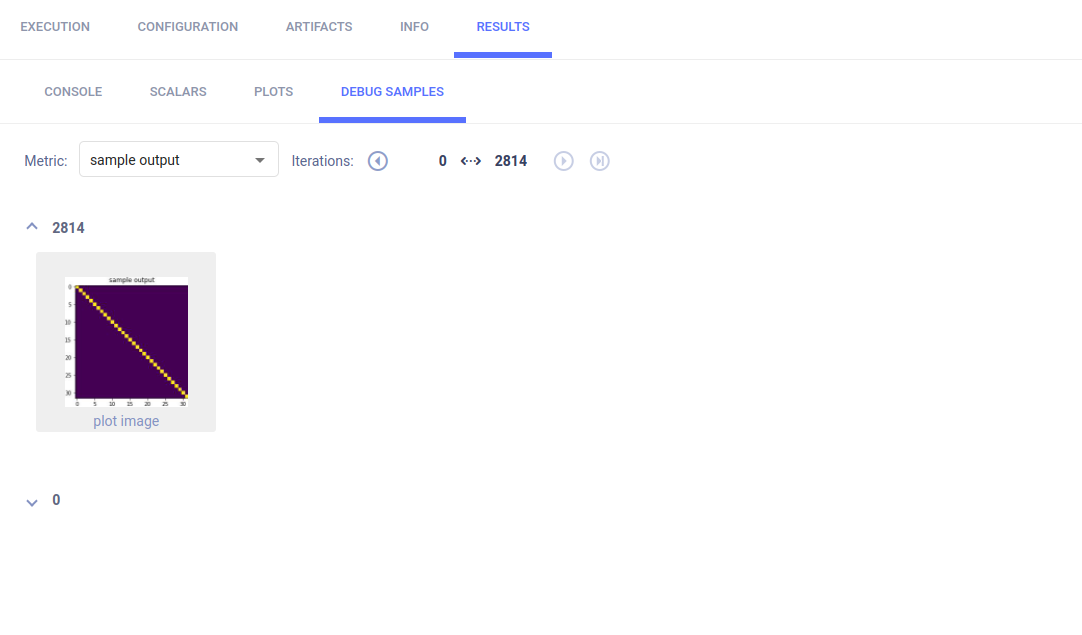 The example calls Matplotlib methods to log debug sample images. They appear in RESULTS > DEBUG SAMPLES.