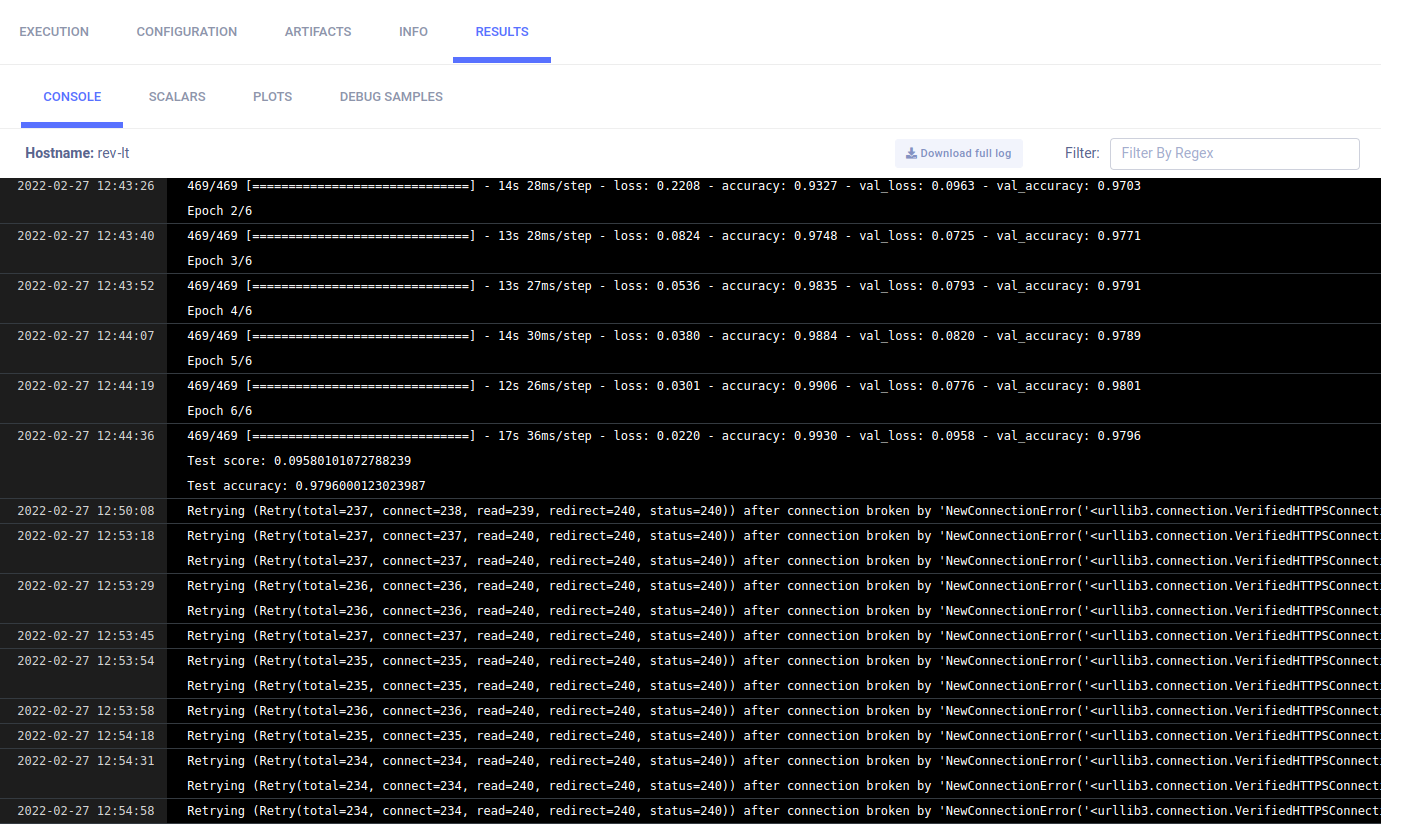 The jupyter.ipynb example demonstrates ClearML's automatic logging of code running in a Jupyter Notebook that uses Keras and Matplotlib.