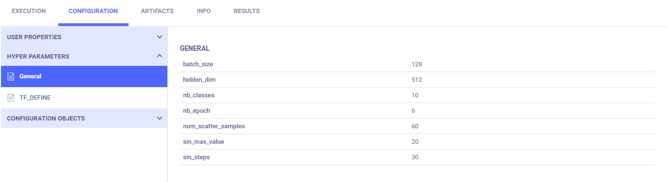 Parameter dictionaries appear in CONFIGURATIONS > HYPER PARAMETERS > General.