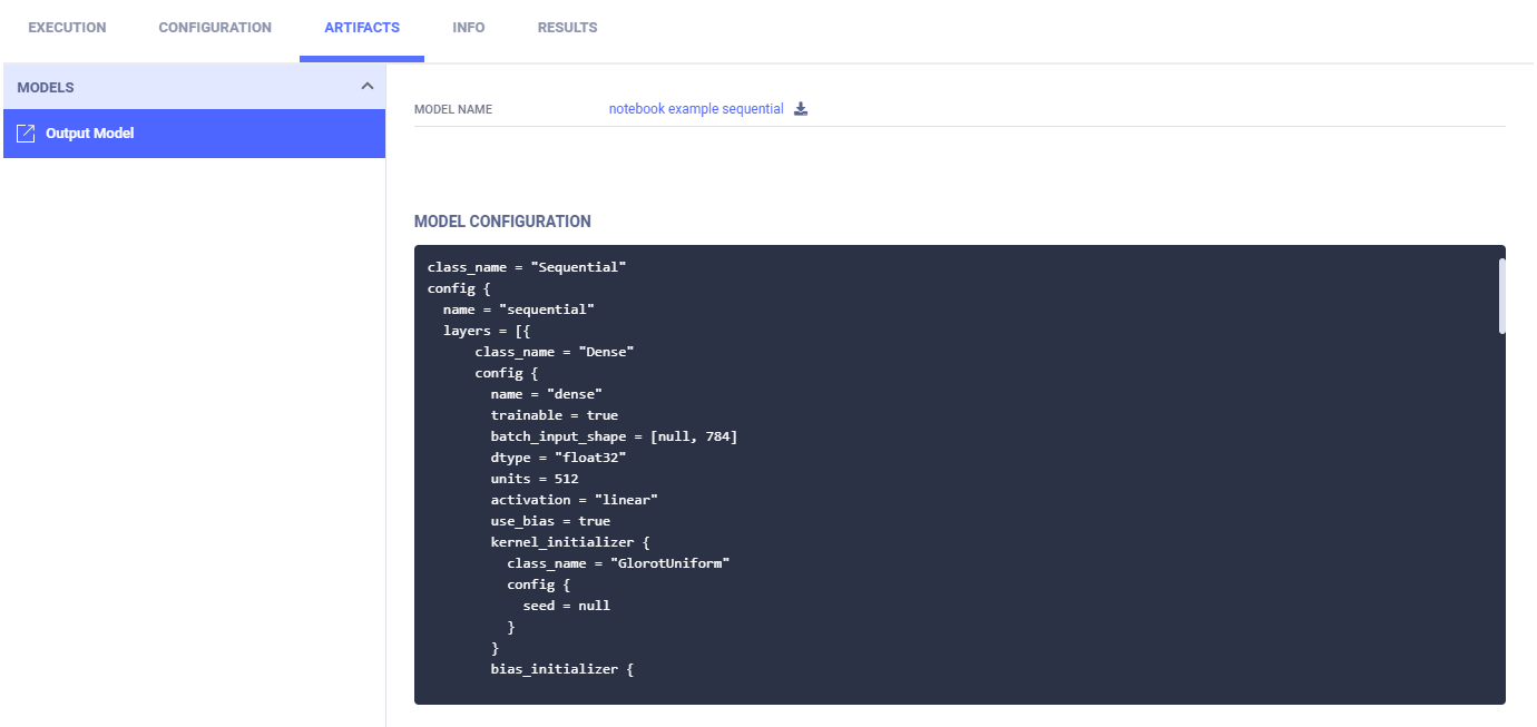 Model artifacts associated with the experiment appear in the experiment info panel (in the EXPERIMENTS tab), and in the model info panel (in the MODELS tab).