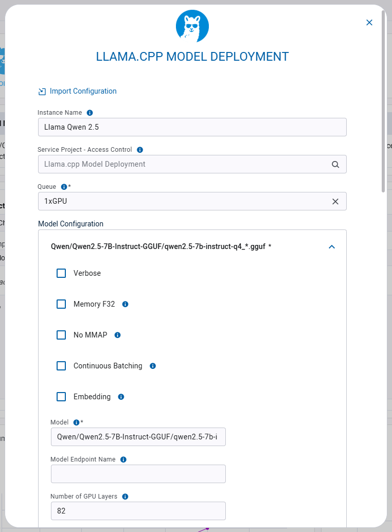 The llama.cpp Model Deployment app enables users to quickly deploy LLM models in GGUF format using llama.cpp.