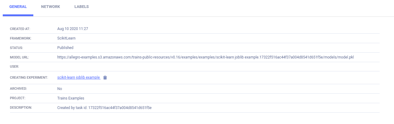 Model artifacts associated with the experiment appear in the info panel of the EXPERIMENTS tab and in the info panel of the MODELS tab.