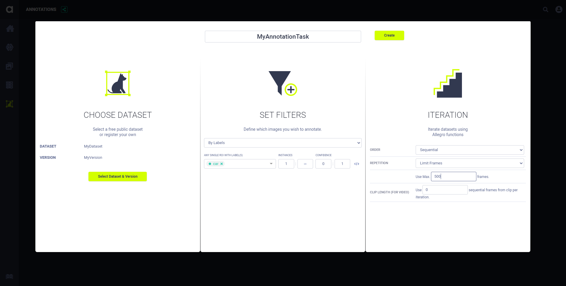 Choose the iteration parameters specifying how frames in this version are presented to the annotator.