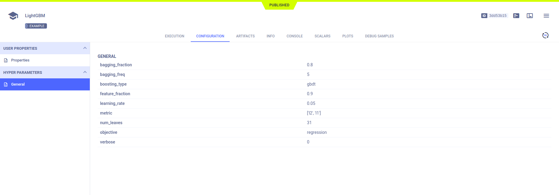 ClearML automatically logs the configurations applied to LightGBM. They appear in CONFIGURATIONS > HYPERPARAMETERS > GENERAL.