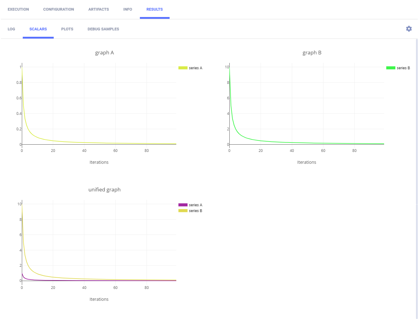 Logger.current_logger().report_scalar("unified graph", "series B", iteration=i, value=10./(i+1))