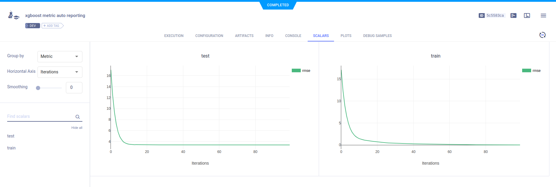 ClearML automatically captures scalars logged with XGBoost, which can be visualized in plots in the ClearML WebApp, in the experiment's SCALARS tab.