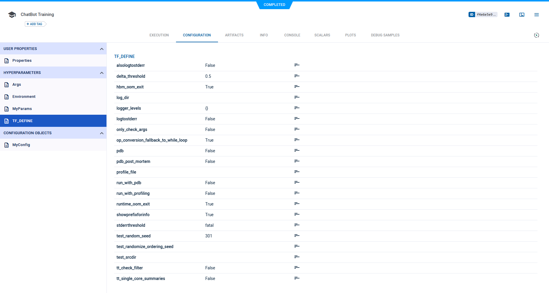 Hyperparameters are grouped by their type and appear in CONFIGURATION > HYPERPARAMETERS. Once a task is run and stored in ClearML Server, any of these hyperparameters can be modified.