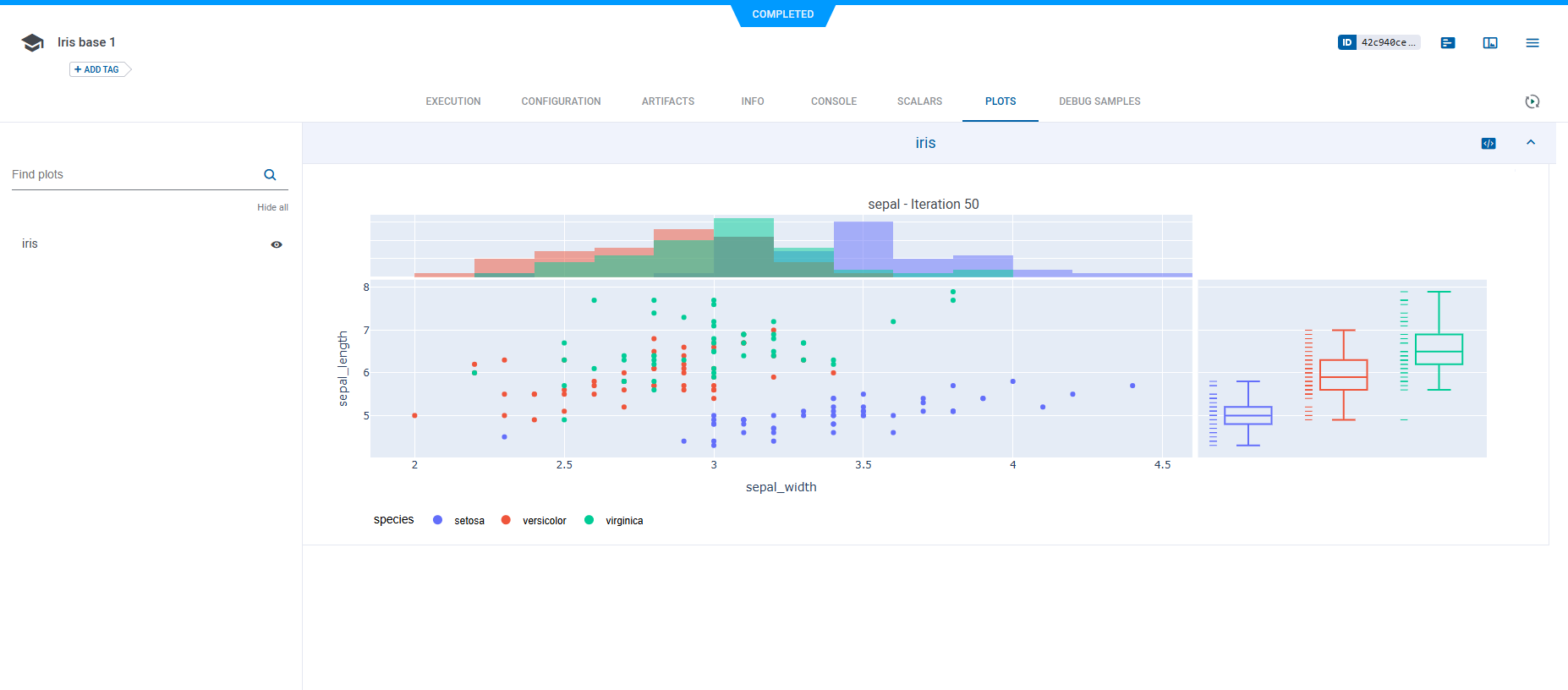 - Plots - Other plots and data, for example: Matplotlib, Plotly, and ClearML explicit reporting.