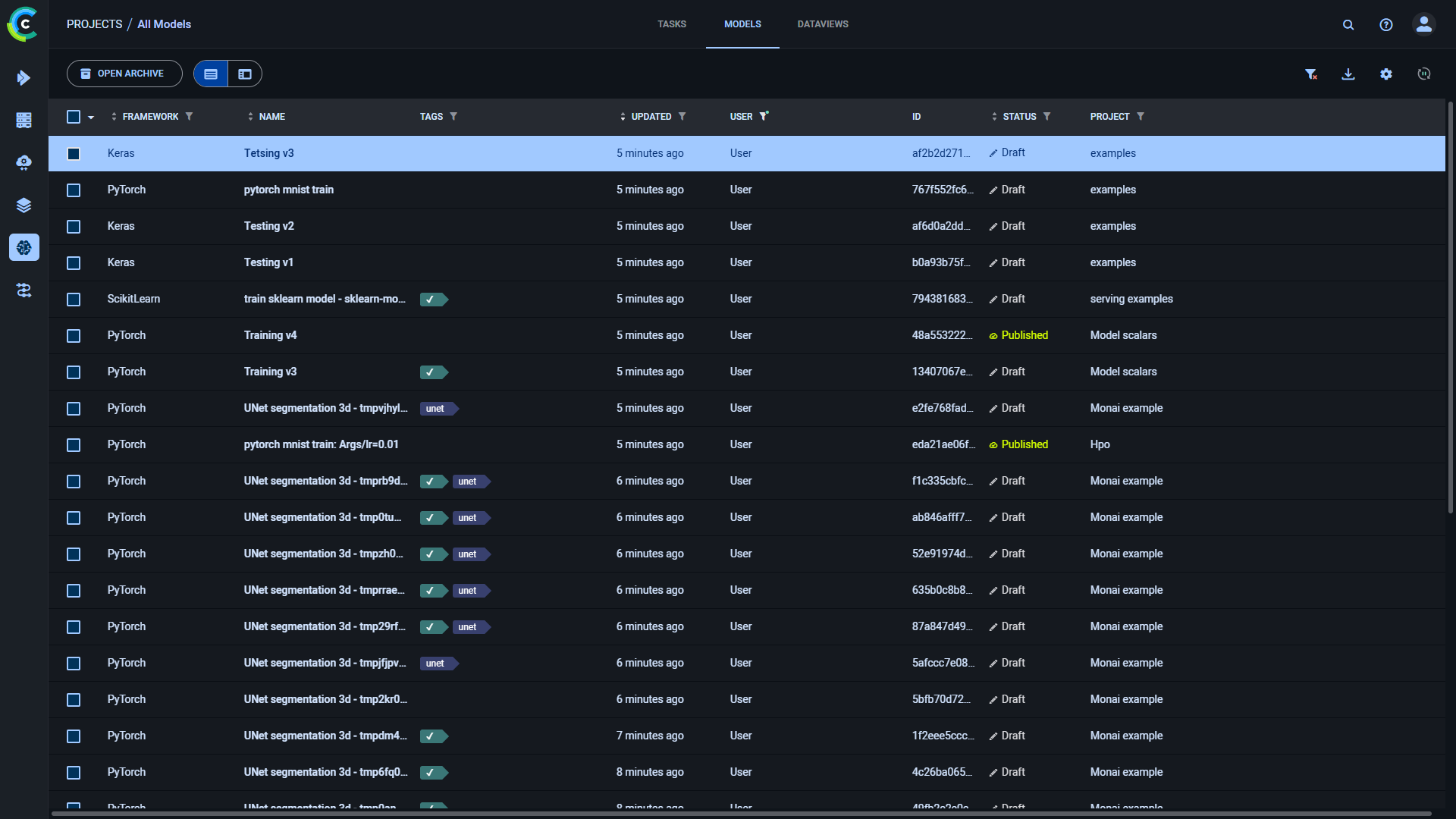 The model table is a customizable list of models associated with the tasks in a project. From the model table, view model details, and modify, publish, archive, tag, and move models to other projects.
