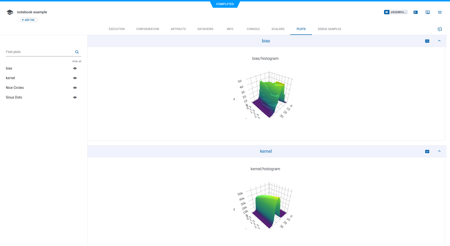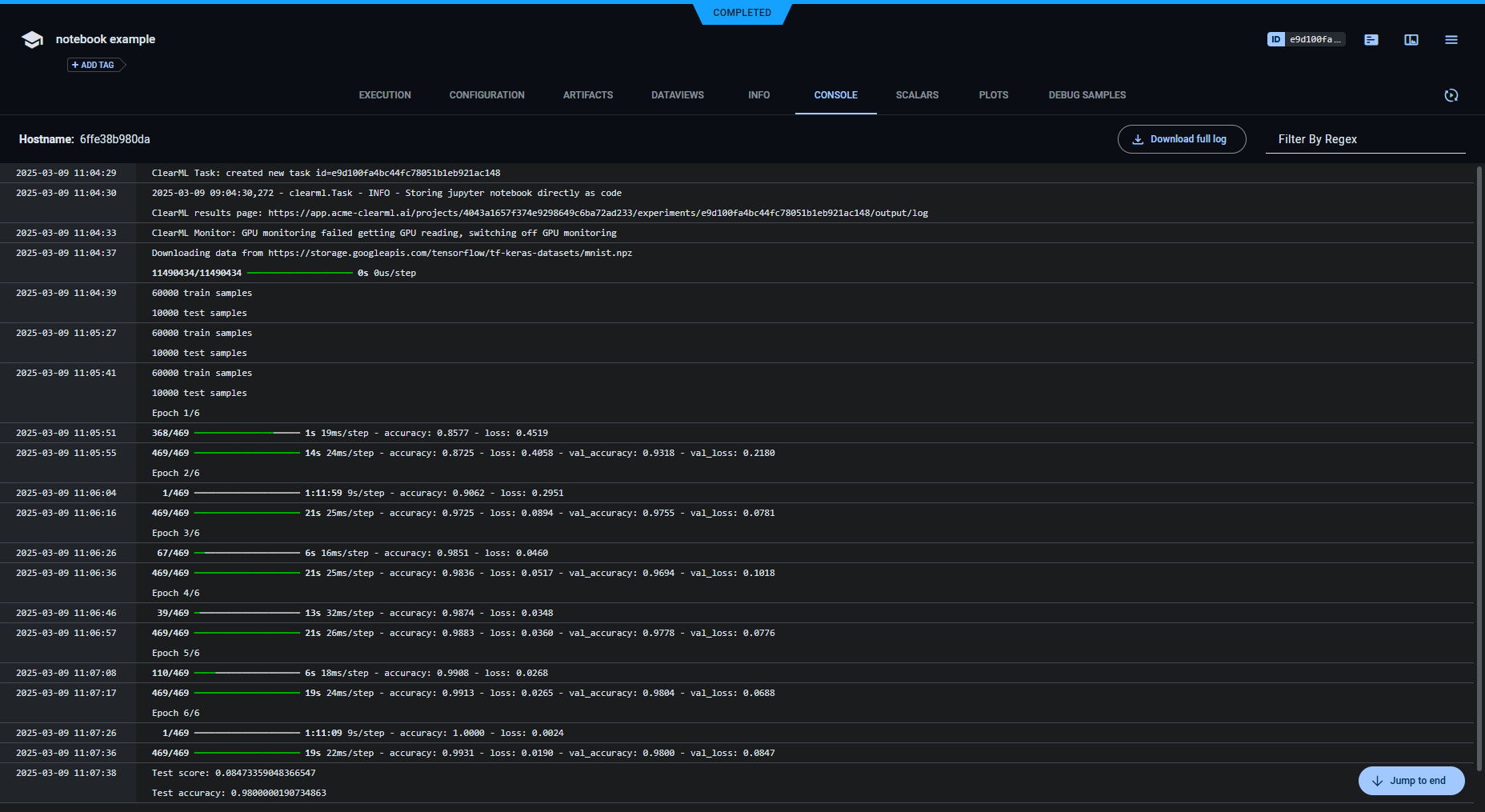 The jupyter.ipynb example demonstrates ClearML's automatic logging of code running in a Jupyter Notebook that uses Keras and Matplotlib.