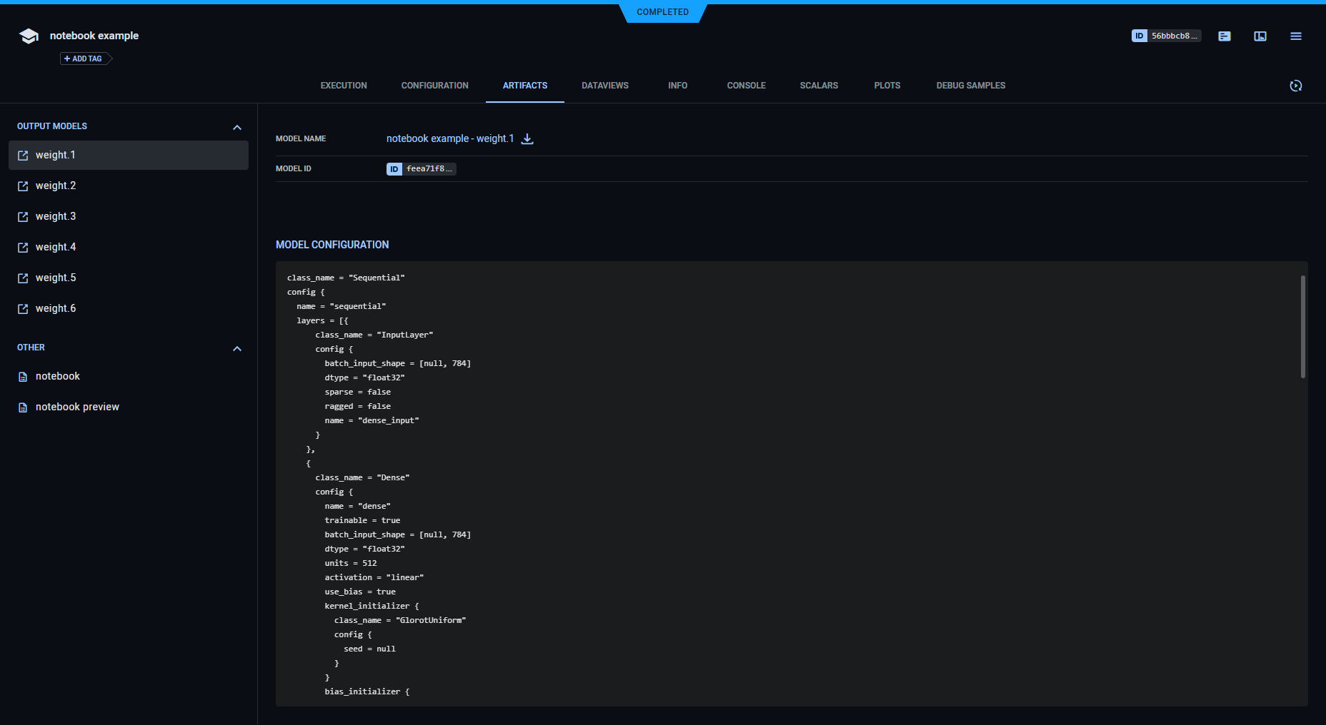 Models created by the task appear in the task's ARTIFACTS tab. ClearML automatically logs and tracks models created using Keras.