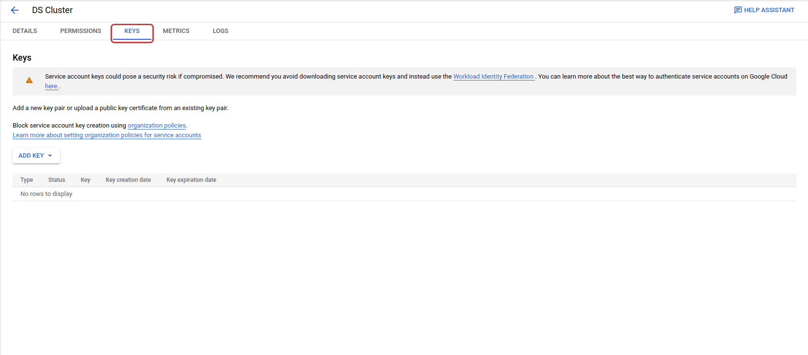 Click ADD KEY and create a key in JSON format. Copy the contents of the JSON file.