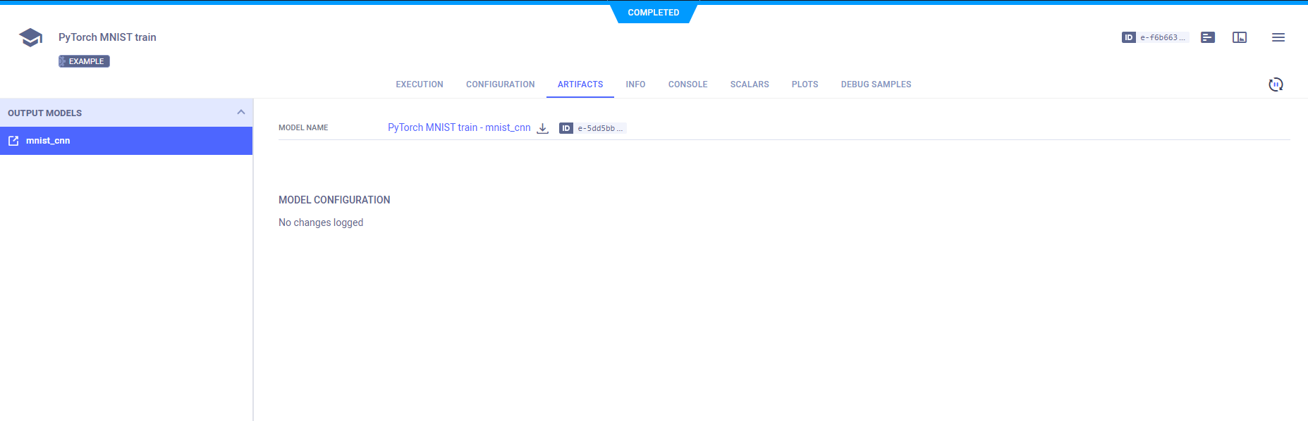 Models created by the experiment appear in the experiment's ARTIFACTS tab. ClearML automatically logs and tracks models and any snapshots created using PyTorch.