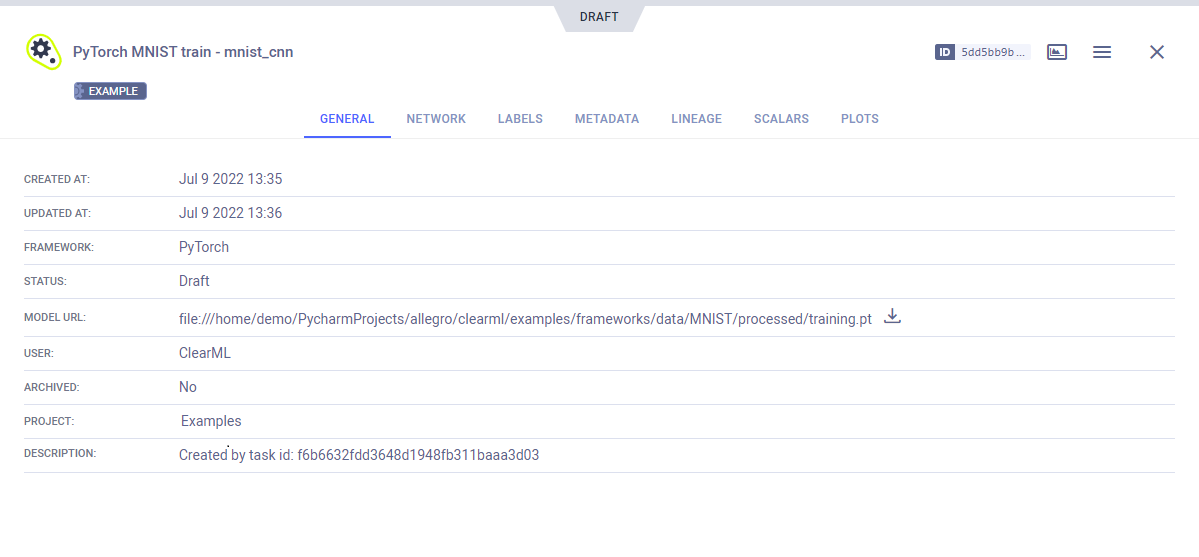 pytorch mnist trainin theexamplesproject. - ClearML automatically logs