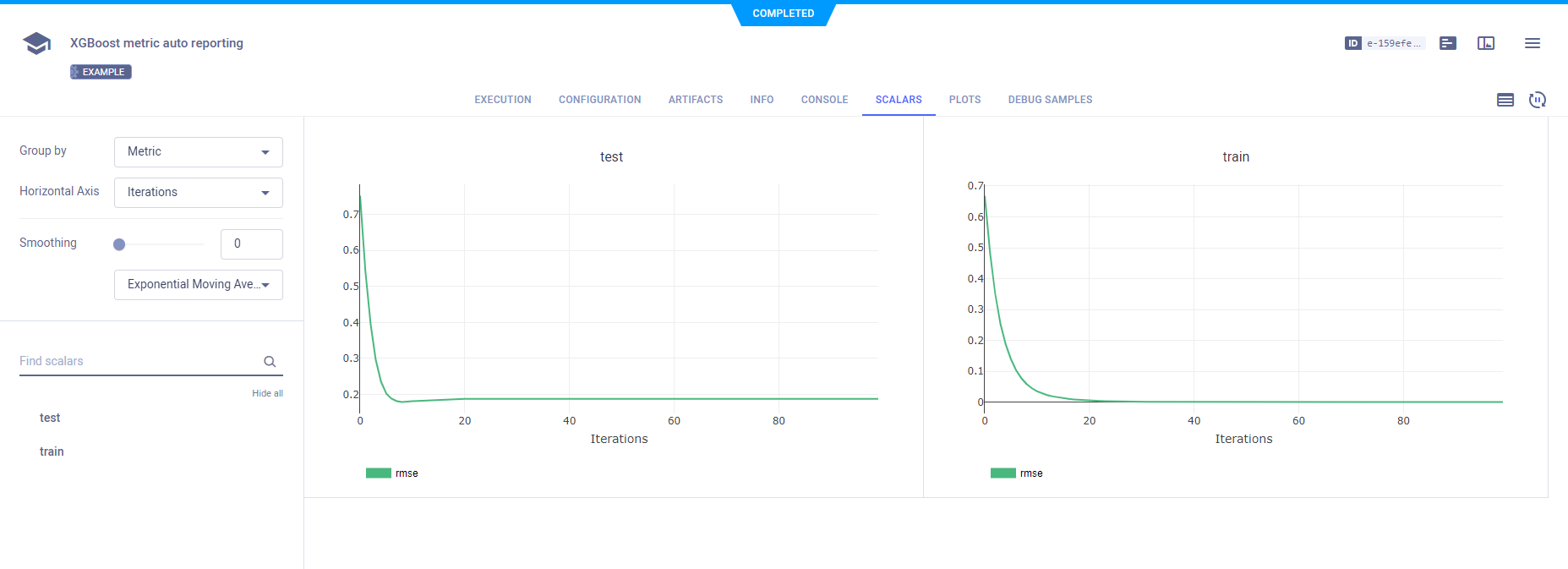 The xgboost_metrics.py example demonstrates the integration of ClearML into code that uses XGBoost to train a network on the scikit-learn iris classification dataset. ClearML automatically captures models and scalars logged with XGBoost.