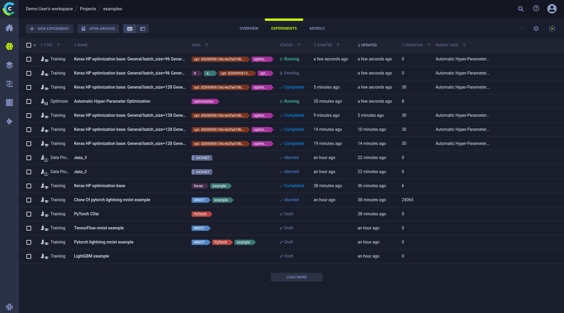 It's also possible to tag Tasks for visibility and filtering allowing you to add more information on the execution of the experiment. Later you can search based on task name and tag in the search bar, and filter experiments based on their tags, parameters, status and more.
