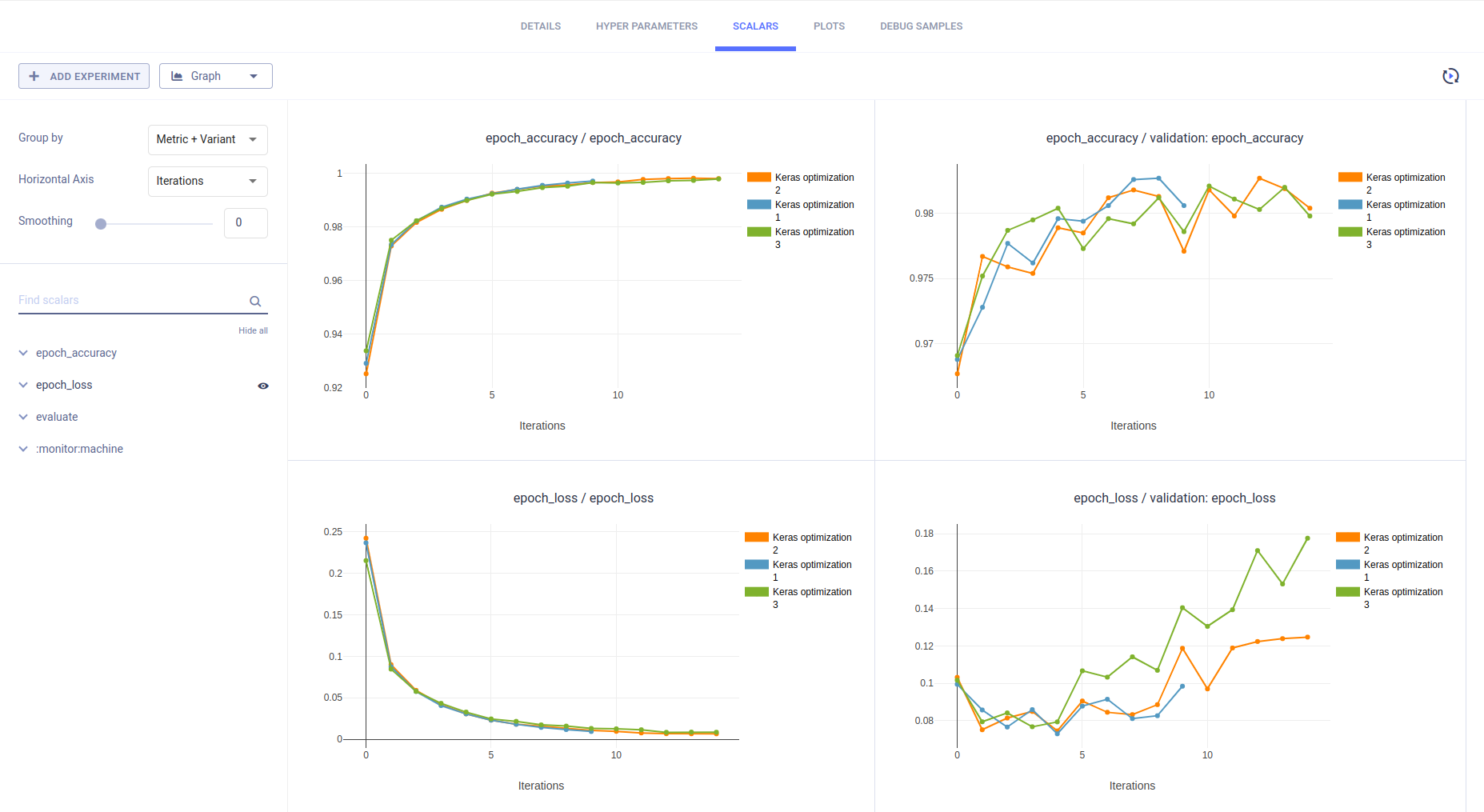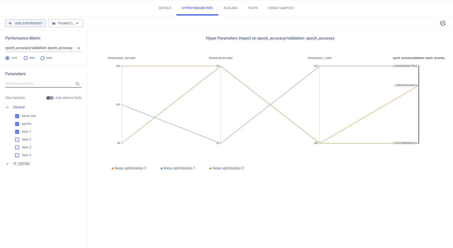 For example, plot the metric/variant epoch_accuracy/validation: epoch_accuracy against the hyperparameters