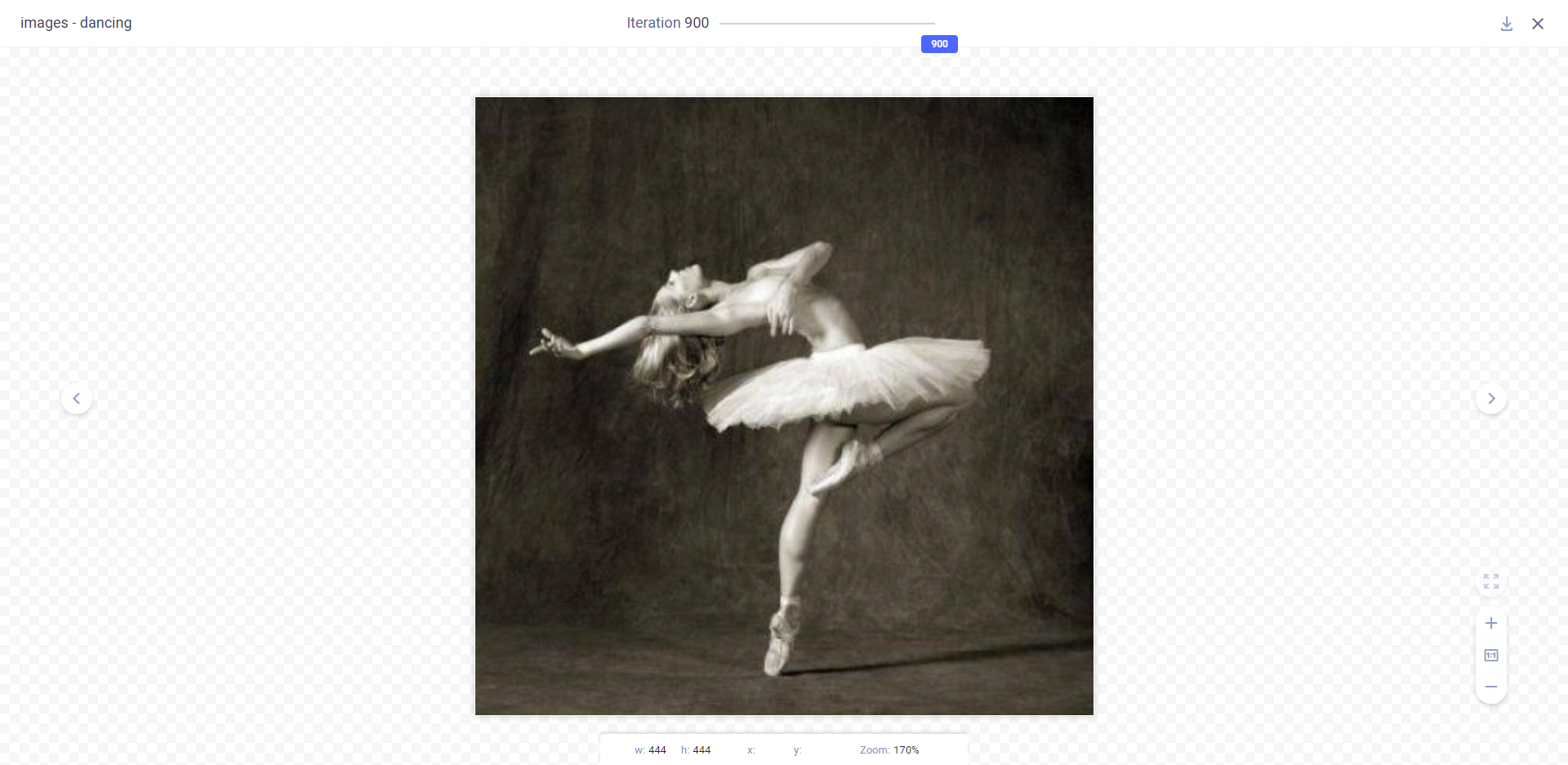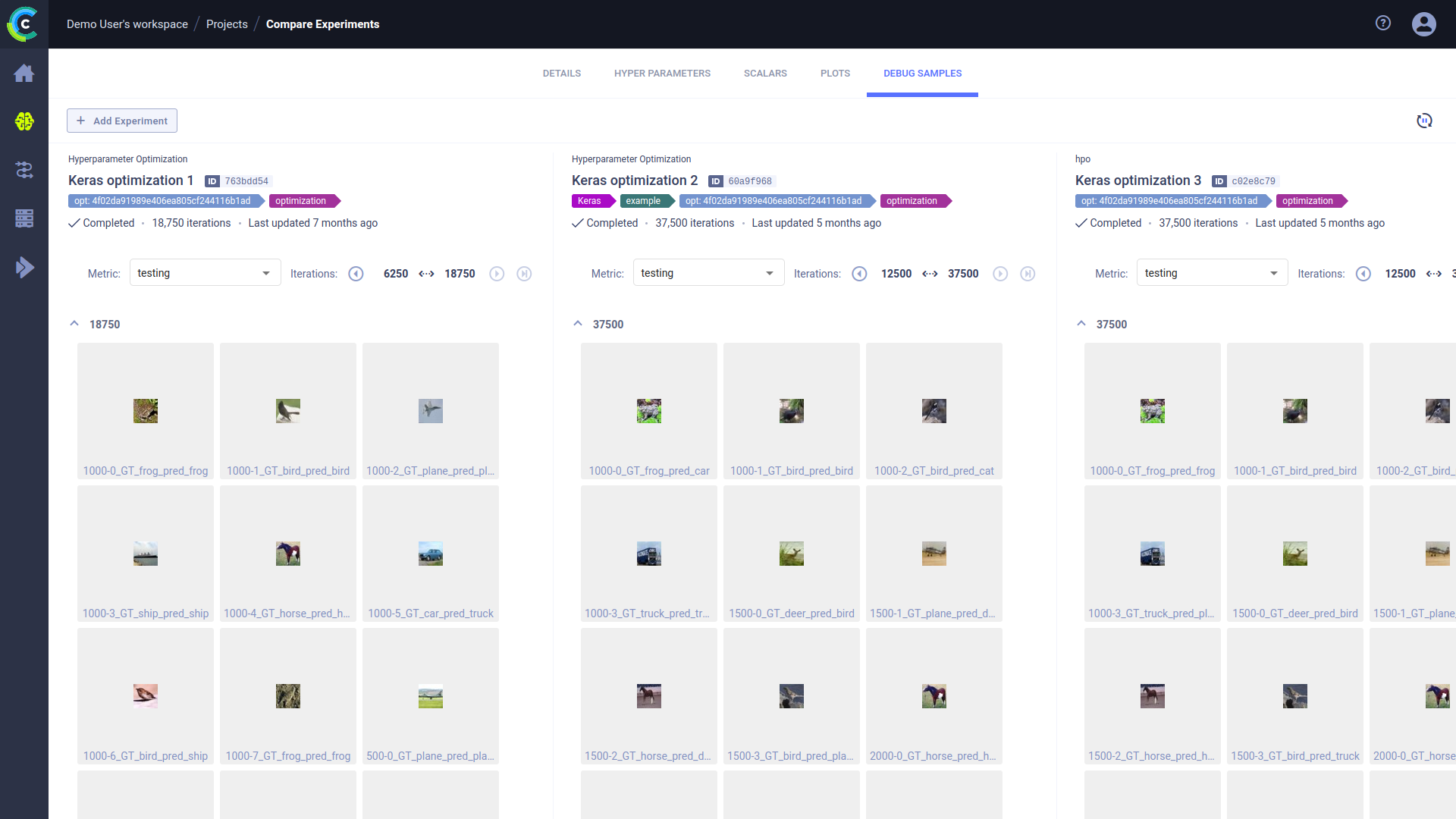 Compare debug samples at any iteration to verify that an experiment is running as expected. The most recent iteration appears first. Use the viewer / player to inspect images, audio, video samples and do any of the following: